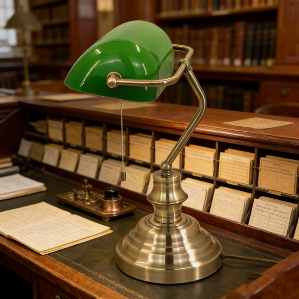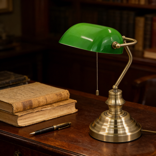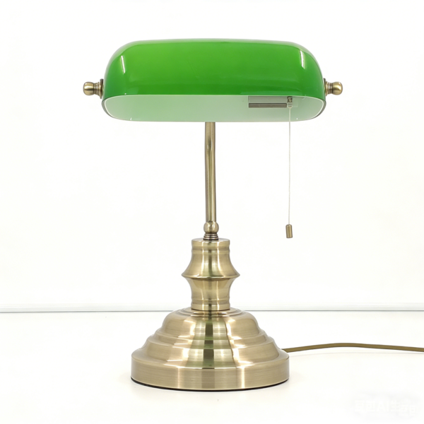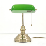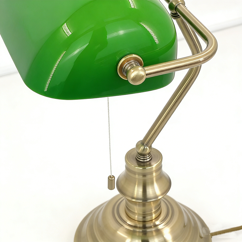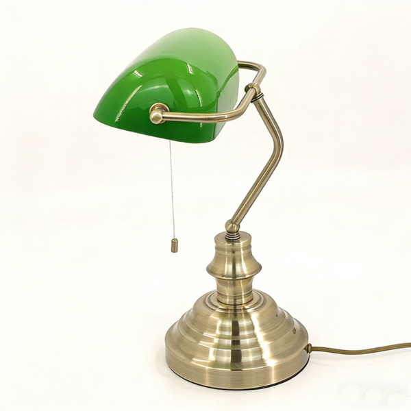 Bring a touch of classic sophistication to your workspace with this traditional banker’s lamp. Featuring a rich green glass shade paired with an antique brass-finished base, this lamp offers focused illumination perfect for reading and studying.