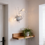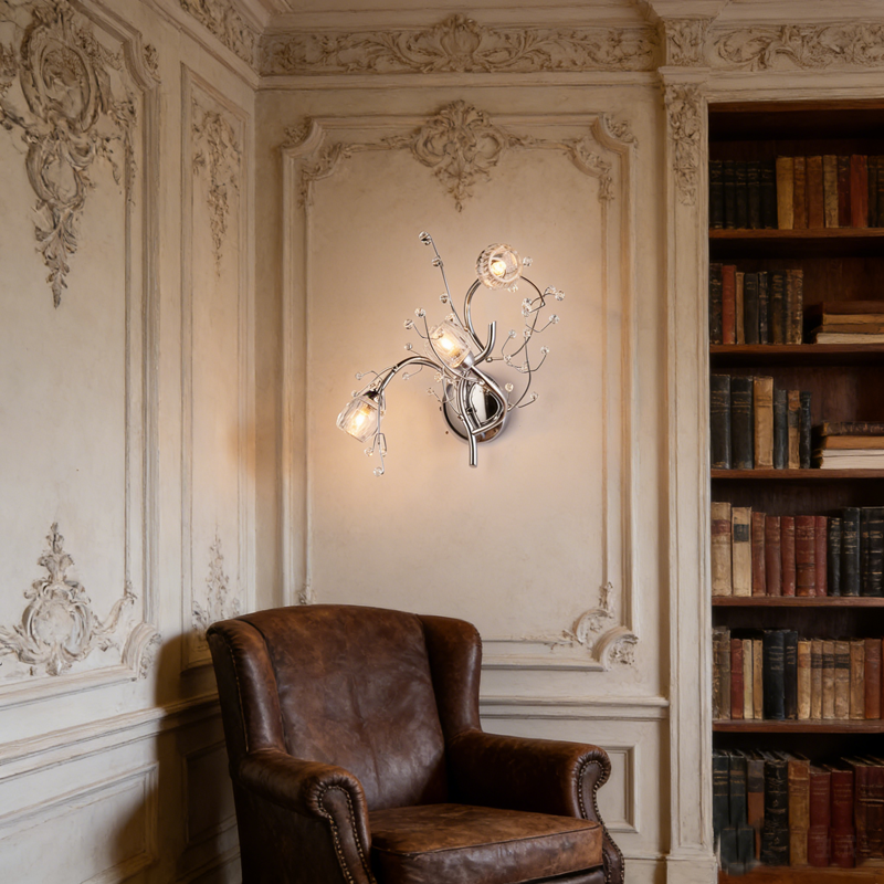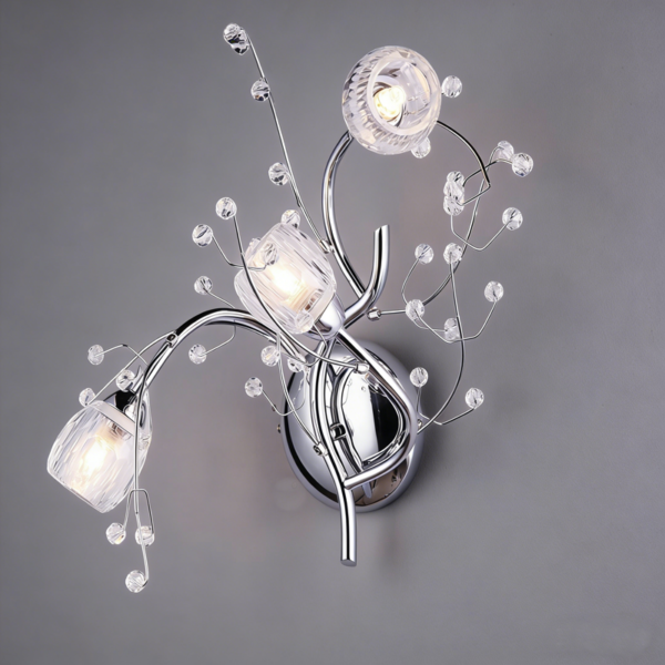 The MW0111-3 wall sconce blends the untamed beauty of nature with modern luxury design. Featuring fluid, polished chrome branches that cradle 3 refractive crystal “buds,” this artistic fixture casts a stunning ambient glow, making it a perfect statement piece for sophisticated interiors.